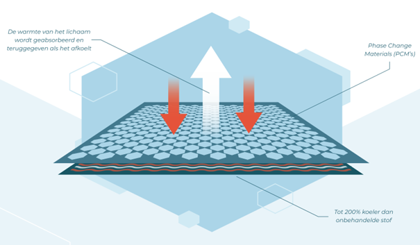 De slimme warmteregulering wordt gerealiseerd door micro-ingekapselde Phase Change Materials (PCM's) die de warmte van het lichaam absorbeert en teruggeeft als het lichaam 's nachts weer afkoelt. Hierdoor blijft het lichaam gedurende het slaapproces op een comfortabele temperatuur.